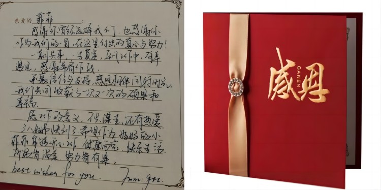 感謝卡:感謝你曾經選擇我們,也感謝你作為我們的一員,在這里付出的真心與努力!一朝共事,一生莫逆,平凡工作中,有幸遇見,感謝并肩作戰。承蒙信任與支持,感恩相伴同行時光,我們共同收獲了一次又一次的碩果和幸福。愿工作的意義,不只謀生,還有熱愛。希望作為媽媽的小菲菲能夠開心工作,健康兩寶,快樂生活,所遇皆溫柔,努力皆有果。Best wishes for you.